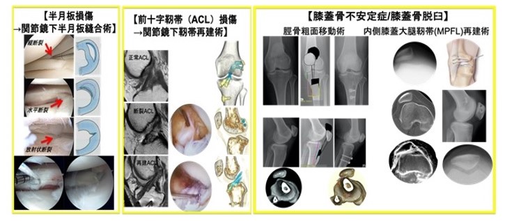 A. 半月板損傷や靭帯断裂では、関節鏡を用いて半月板修復や靭帯再建術を行い、疼痛改善、安定性を