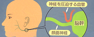 顔面神経は脳幹から出て顔面の筋肉に分布しますが、その近くを走っている動脈がこの神経の根元のところを圧迫しますと神経線維の電位に異常をきたし、顔面の筋肉がけいれんするようになります。血管が神経を圧迫しているかどうか確かめるには、MRIで判定します。