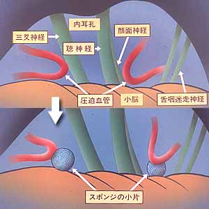 手術は全身麻酔のもとで、手術用の顕微鏡を用いて圧迫している血管を神経より慎重に遊離し、血管がふたたび神経を圧迫しないようにします。手術時間は、全身麻酔を含めて大体4~5時間位です。術後7~8日に退院が出来ます。